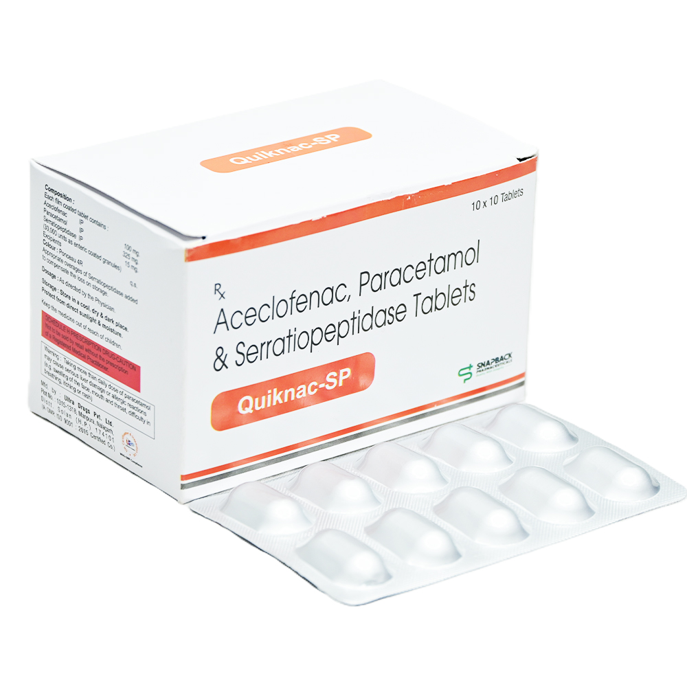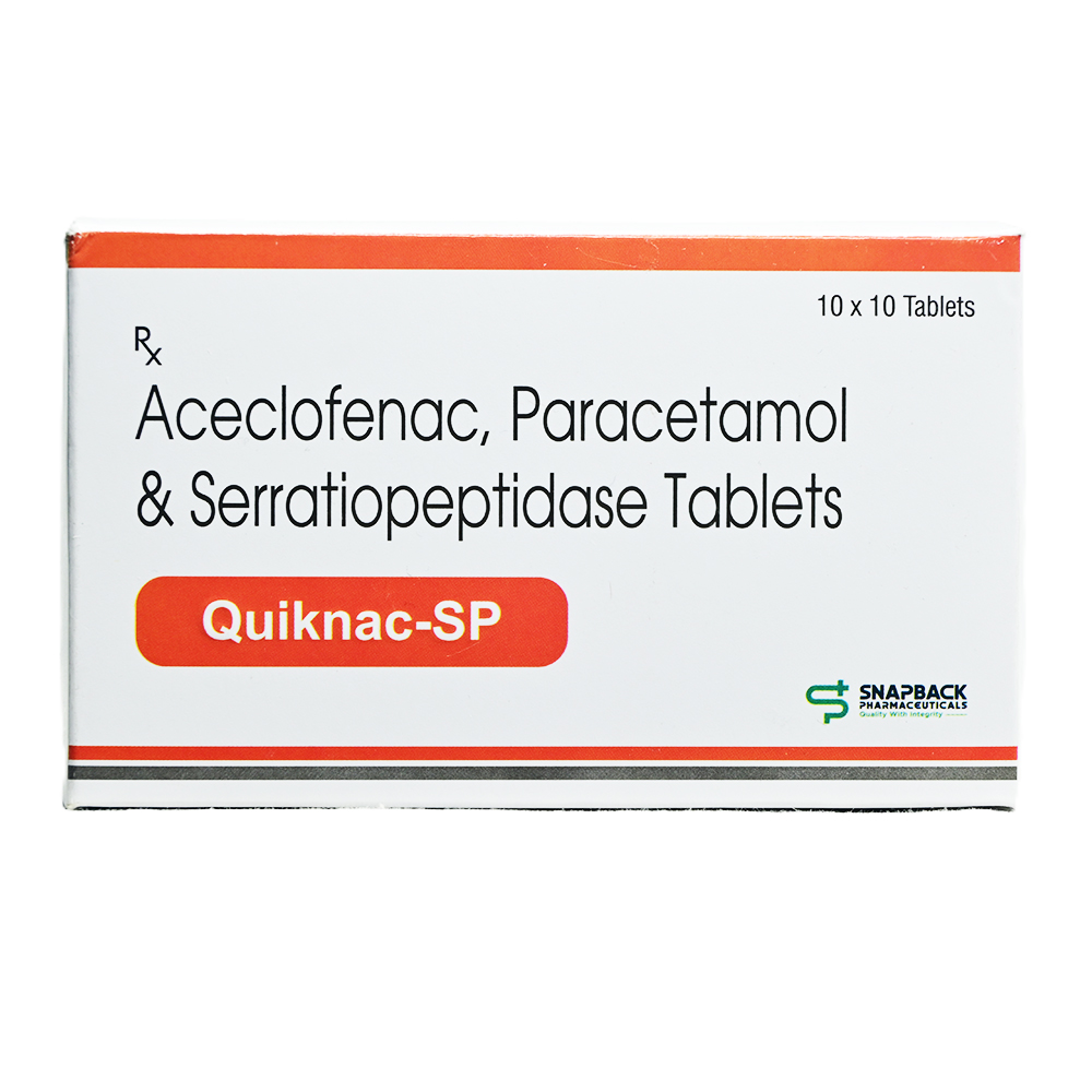 Quiknac-SP Tablet is a combination of three medicines: Aceclofenac, Paracetamol and Serratiopeptidase. Aceclofenac is a non-steroidal anti-inflammatory drug (NSAID), and Paracetamol is an antipyretic (fever reducer). They work by blocking the release of certain chemical messengers in the brain that cause pain and fever. Serratiopeptidase is an enzyme which works by breaking down abnormal proteins at the site of inflammation and promotes healing.